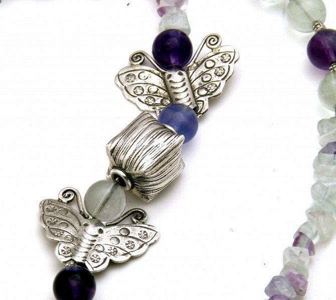 Fluorite is a very unusual gemstone as it occurs in so many colours. Showcasing a rainbow spectrum of fluorite rounds and a pair of laughing butterflies in silver, this necklace encourages the celebration of natural beauty and the strength of devotion. The silver boxes evoke gifts and festivities. Wear this to merry-make- and make memories!