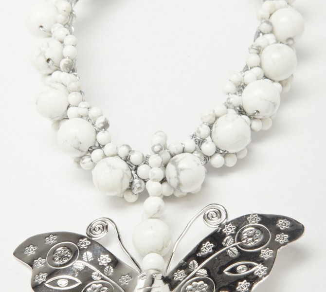 This is a neckpiece fit for a white queen. Imagine a crust of stunning white Howlite beads encircling the neck, while a colossal bright silver butterfly twinkles on the collar; a recipe to turn heads! Not for the faint hearted.