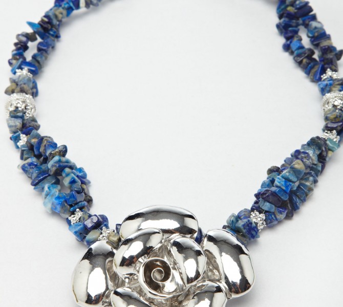 The brilliant blue of lapis lazuli is worn by nobility and kings of the old. Deep blue and glossy silver (gold), lapis lazuli and rose; symbol of heaven and emblem of love, this is a tour de force of beauty and meaning.