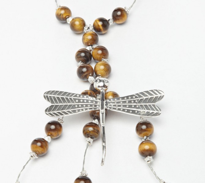 A walk through the woods – Attention all naturalists! Express your love for the outdoors with naturally occurring tiger eye, shaped into balls. A silver dragonfly is added for a touch of friskiness.