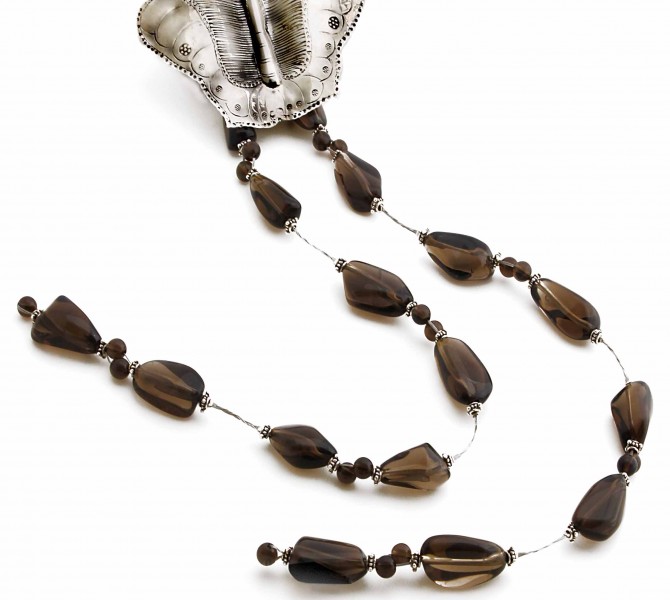 Glassy, spectral and enigmatic are some of the words one can ascribe to smoky quartz and its patrons. Prized for its unusual colour and clarity, the smoky quartz is also sought for its calming, grounding properties. This dramatic jewel has been strung with silver beads and a brilliant butterfly piece to give the necklace a boost of glistening capacity. Wear this to show that there is more to you than meets the eye....
