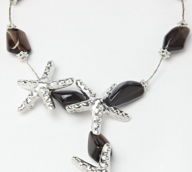 The use of smoky quartz exudes an air of mystic and magic, and coupled with an adornment of 3 shimmering silvery starfish, one would inevitably be the centre of attention and a definite head-turner....