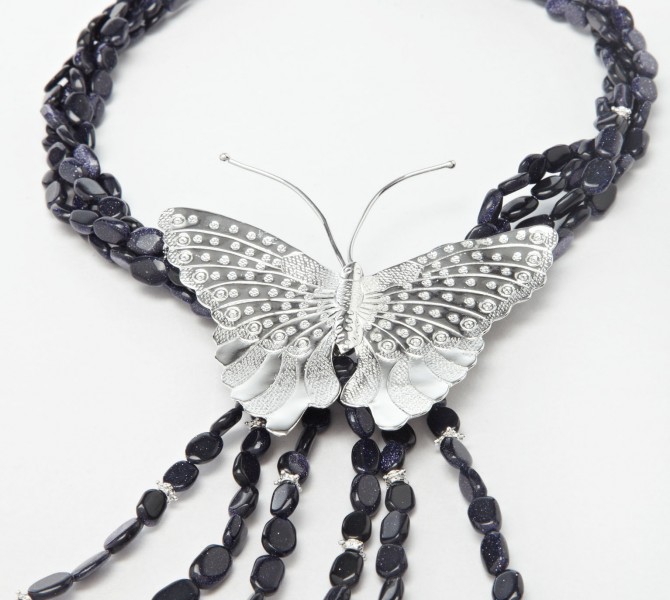 This elegant, indigo coloured Silver Sandstone Necklace has Indian inspired elements and is a special edition piece created just for President’s Challenge ’09. The understated shiny beads weave around the neck and conclude in a large decorative handcrafted silver butterfly centrepiece, a creature beloved by Mrs Nathan herself. It then breaks out in a fringe style to give the necklace movement, symbolizing the freedom of movement of the butterfly....