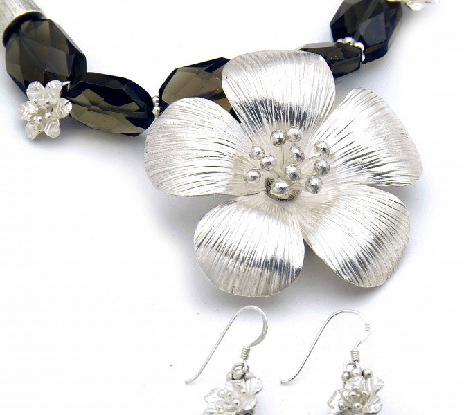 Frangipani symbolizes perfection. In nature, the frangipani plant is seductive to many senses; it is sweetly perfumed, visually enthralling and buttery to the touch. Beauty aside, the frangipani is a survivor. Paired with the mystical smoky quartz, this silver frangipani necklace is a statement of self-affirmation and quiet confidence.