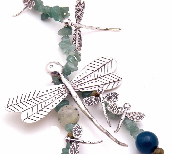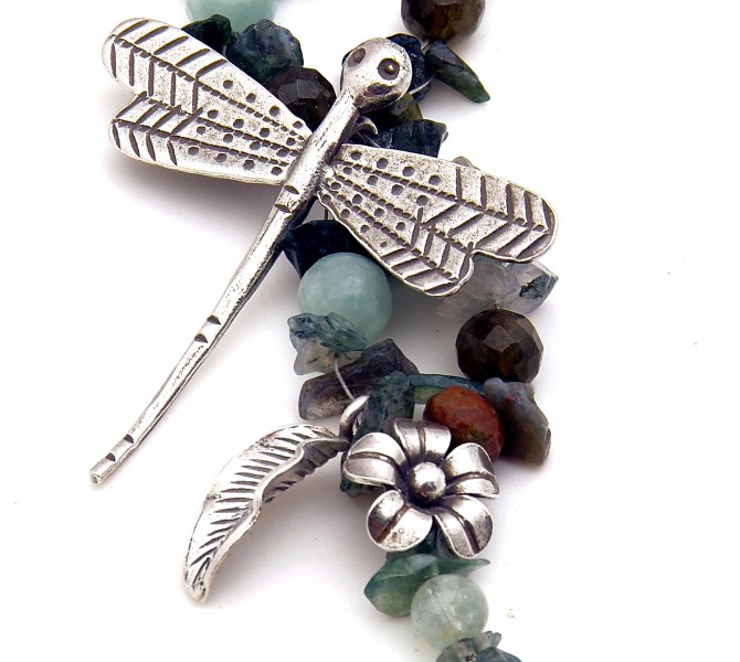 Spring has arrived once again, and creatures great and small have come out to dance among the fresh greenery. The play on different sized dragonflies and stones gives an edgy feel to this piece certain to bring confidence to the wearer.