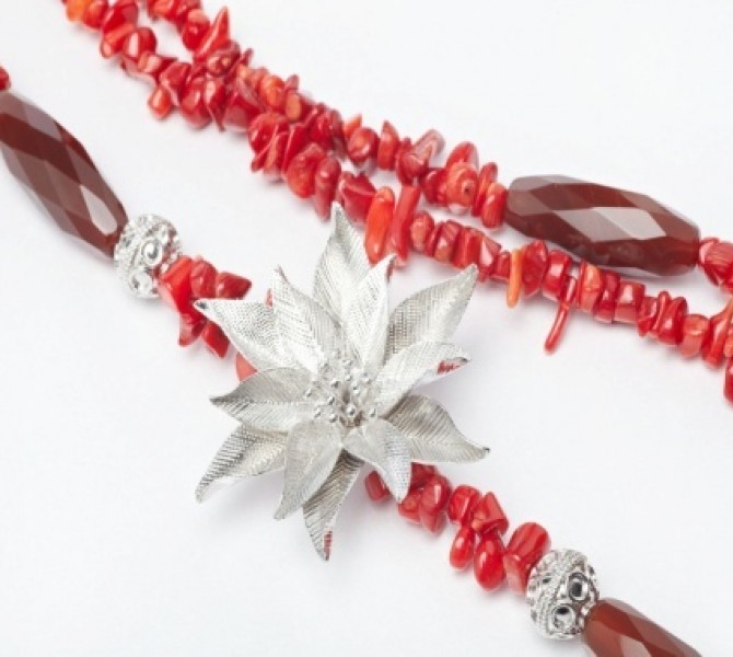 Rich red coral chips accompany an ornate poinsettia to ensure a feast for the visual palate. Red is the colour of life, and silver, the choice of sophisticates. Poinsettia is also known as the Winter Rose, for it represents mirth and merry at year-end gatherings. You may be wearing a winter bloomer, but don’t let that stop you from parading this at parties all year round, taking people’s breath away....