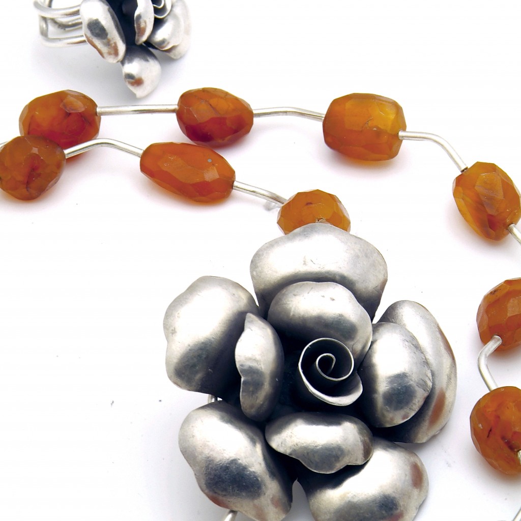 Many deem the lively orange carnelian as an advocate of creativity, and the Egyptians believed in its power to dispel fury and tetchiness. The single rose wrought in 925 silver is a symbol of simplicity and faith in love.