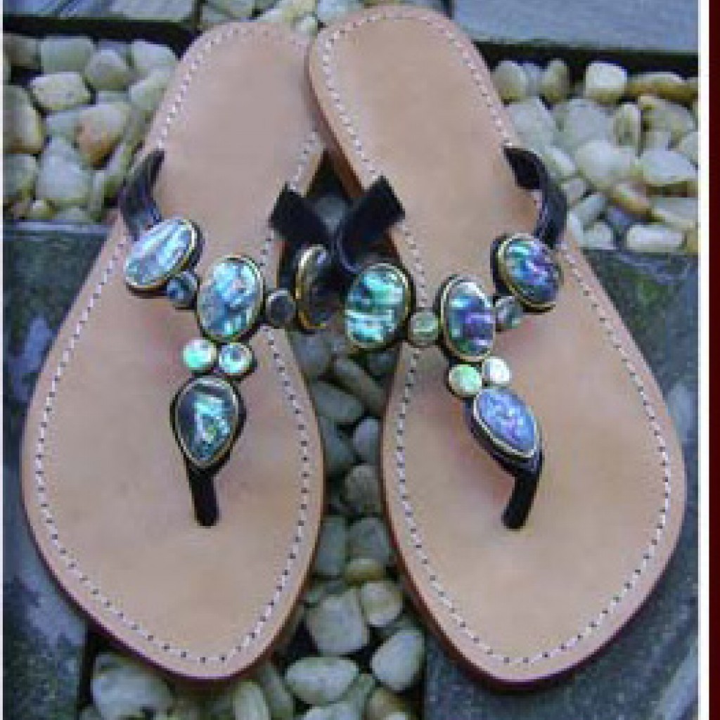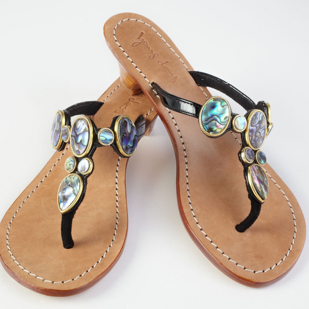 These sandals are embellished with mesmerizing abalone shells, set in gold tone metal bezels atop the straps of mystique flat leather sandals, and will jazz up any outfit.