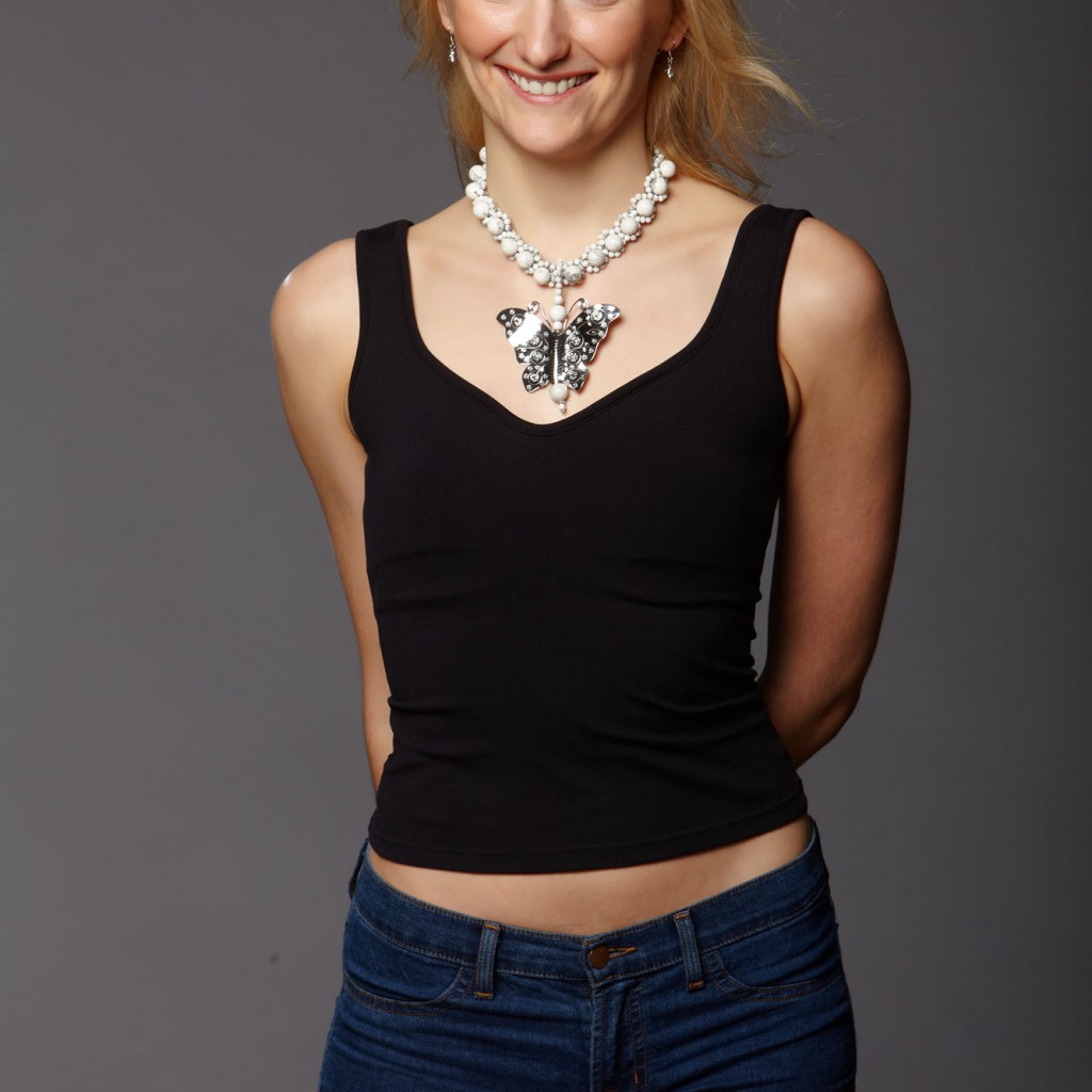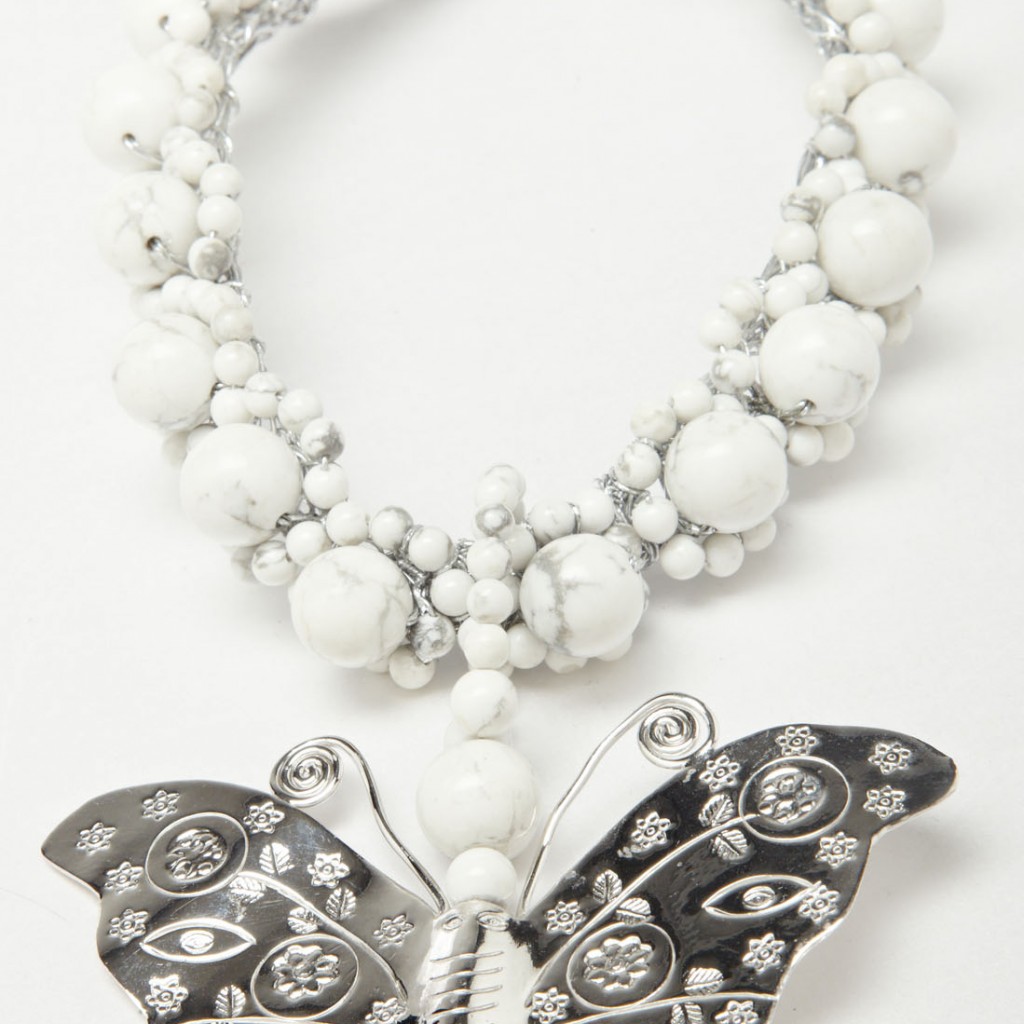 This is a neckpiece fit for a white queen. Imagine a crust of stunning white Howlite beads encircling the neck, while a colossal bright silver butterfly twinkles on the collar; a recipe to turn heads! Not for the faint hearted.
