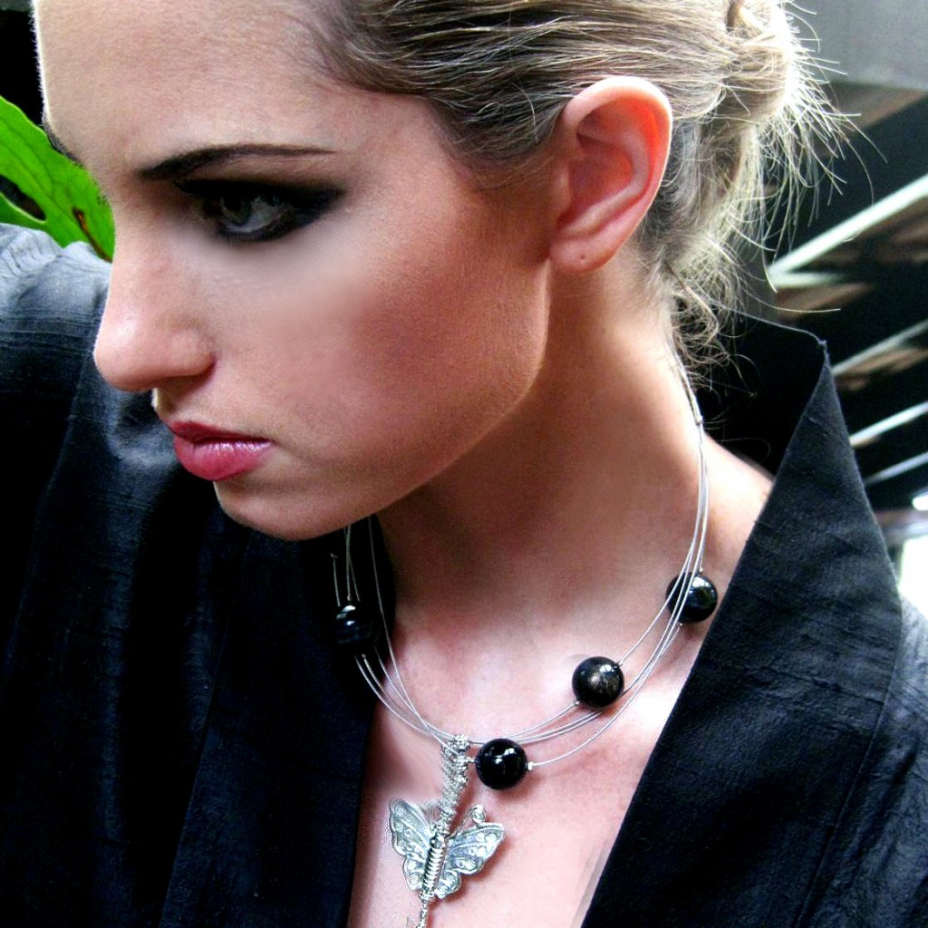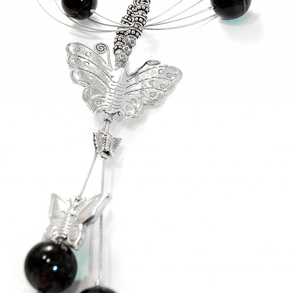 Round Hawk Eye beads recall the mysterious manner in which circles are familiar in the natural universe. The circle is the shape of the sun, the planets, the eye and bubbles. The dark bands within the hawk eye possess a silky gleam under light that is subtle but impossible to miss. We have blended the dark hypnotism of the hawk eye, with the splendid, clean shine of silver butterflies to create a stylish lariat of cosmic distinction.
