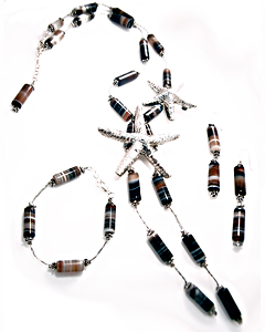 Reminiscent of ancient fossils that build up the sedimentary slabs on the seabed, banded lace agate columns are loosely strung to evoke the delicate allure of beaches and ocean floors. The silver starfish compliments the nude tones of lace agate and remind us of long, languid trips to the sea shore.
