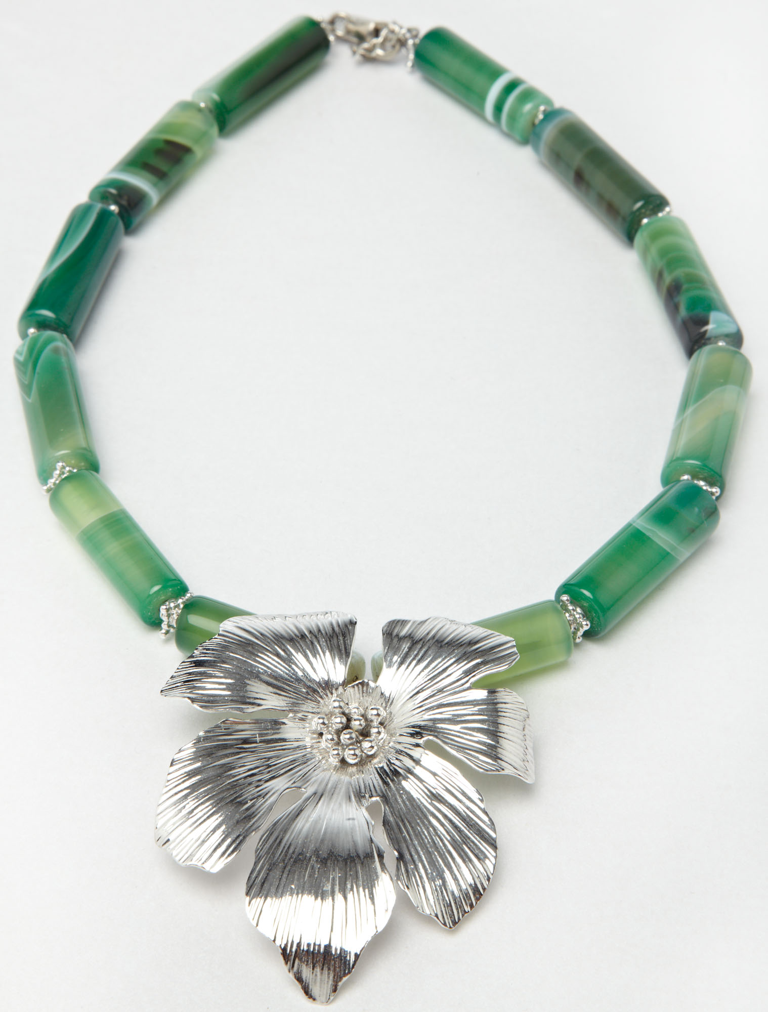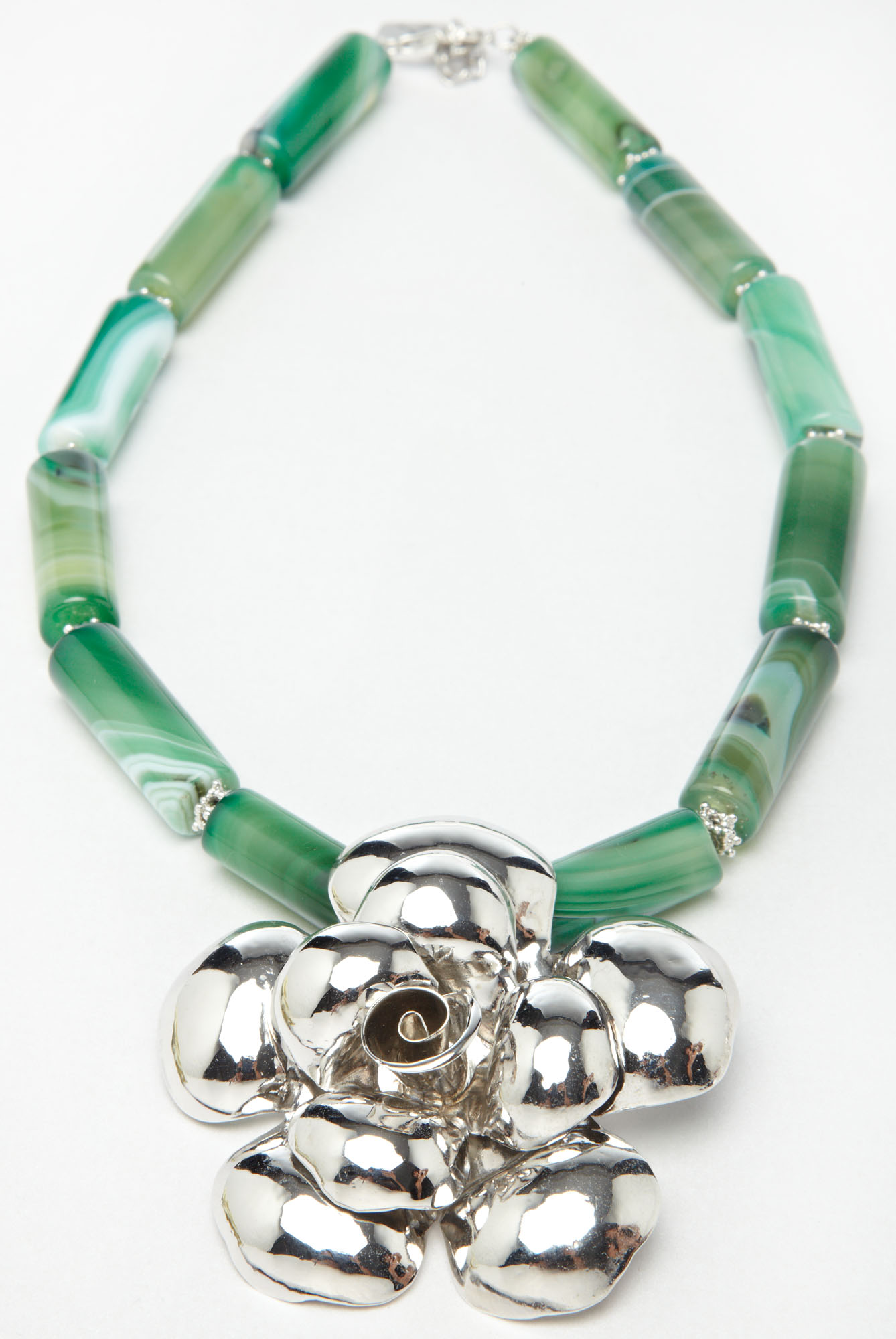 Green is the colour of life! Green represents Mother Nature in all her glory: forest, bush, tree, grass. The playful swirls in green moss agate suggest the lushness of wilderness and woodland. A silver rose serves as focal point of this collar necklace and conceptually gathers the piece as an emblem of hope and abundance.