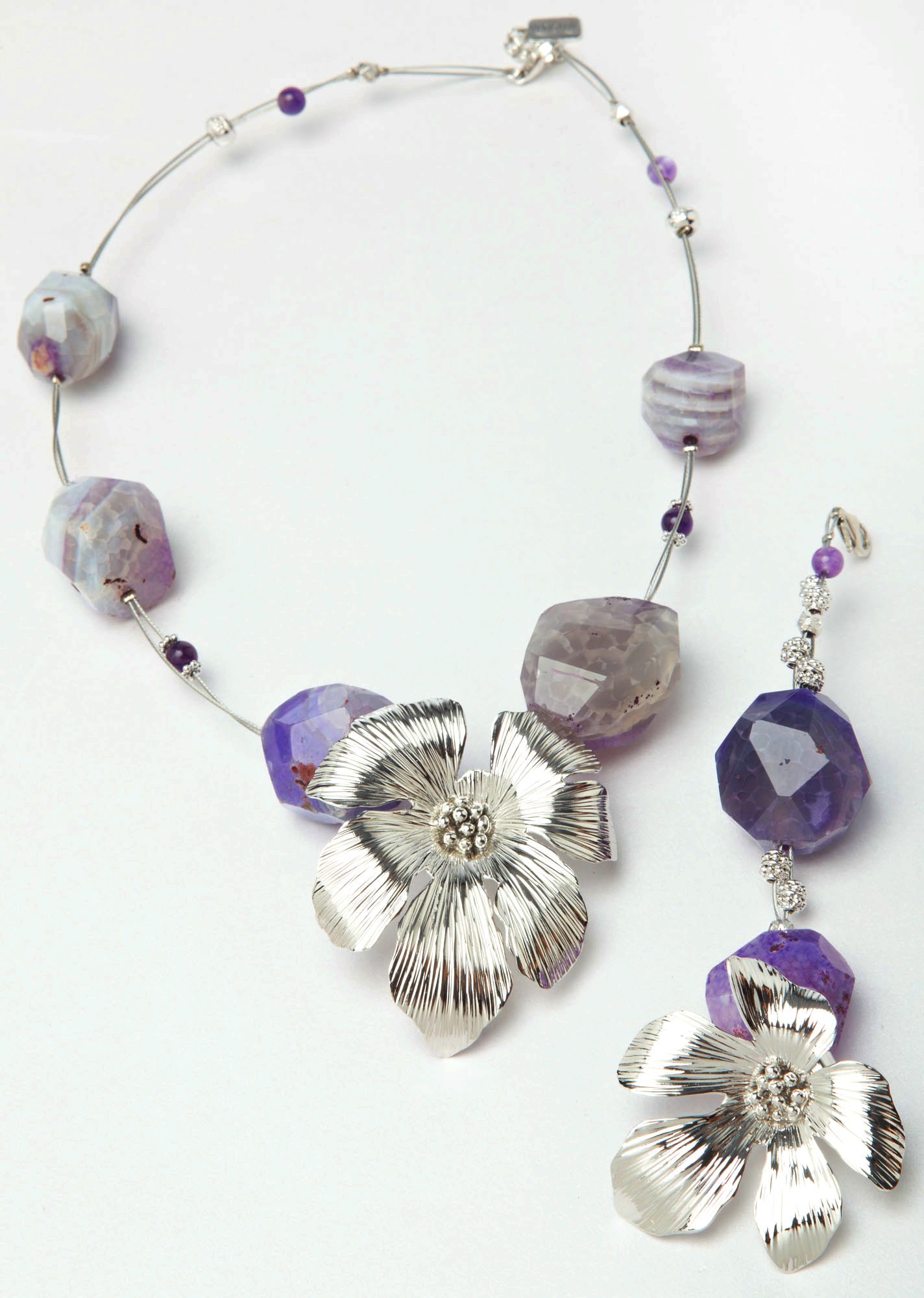 Be enveloped by magic and mystery when you adorn yourself with this necklace of mauve and silver floral detail. A woman who wears purple agate is stylish and sophisticated. The beads in this lariat necklace are irregular and unique, just as how its wearer is distinct and confident.