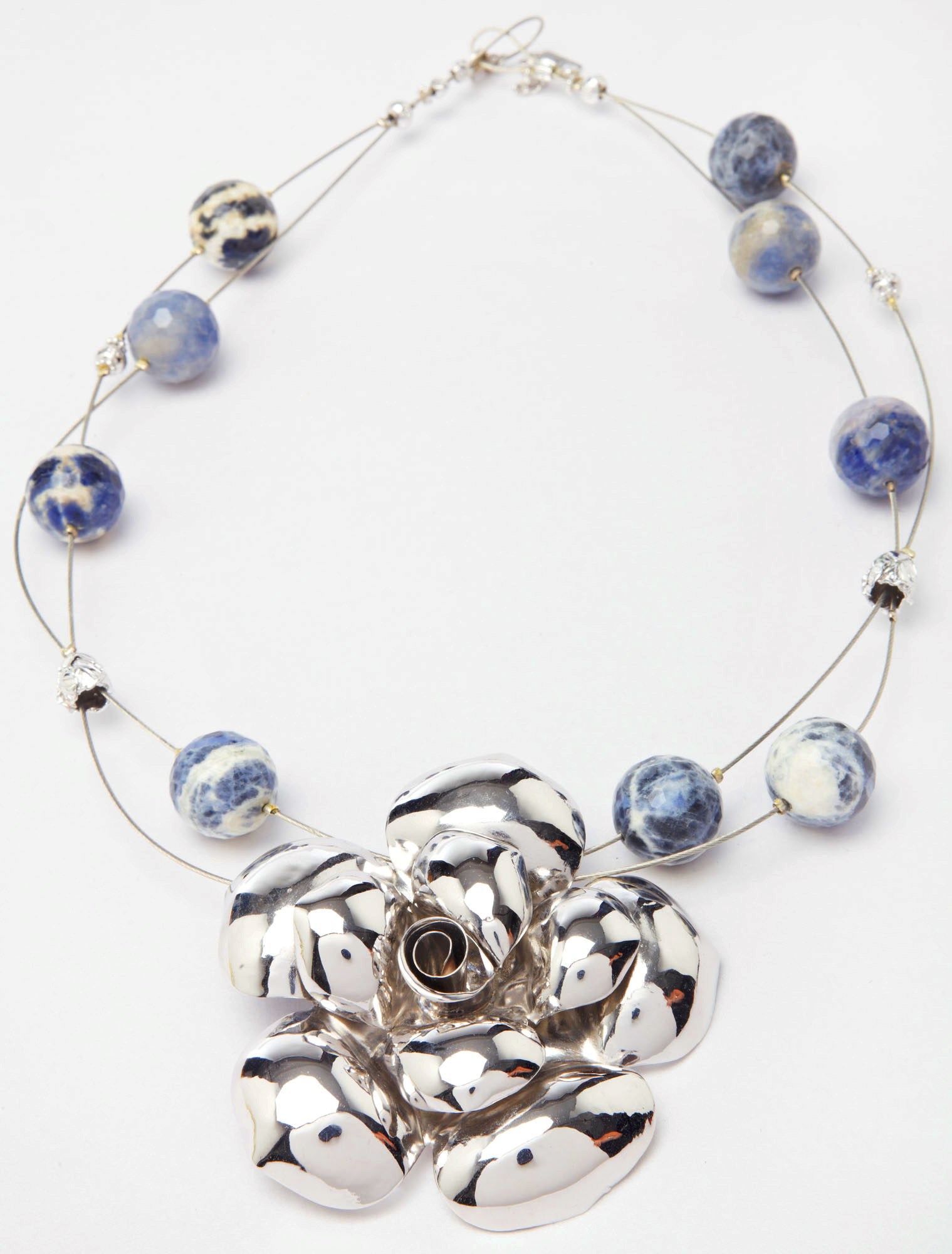 Blue orbs and sliver roses make a regal and romantic combination. Accented by little silver rosebuds, this necklace tells a story of how time transforms shy blooms into their bold, dramatic maturity. Quirky and whimsical, the blue agate rose piece never fails to make an unusual impression.