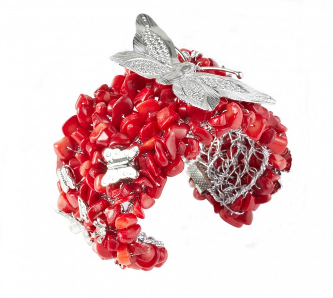 Flora and fauna in all their glory are represented here by that which is often said to be the most beautiful creature and plant on earth; the butterfly and the rose. Inspired by gardens of mature red rose given animation by patron butterflies of all shape, sizes and patterns, we present to you Red Eden - a part of paradise on earth. Made with red coral in juicy red and accented by silver butterflies, this bracelet is perfect for confident, sexy women. ...
