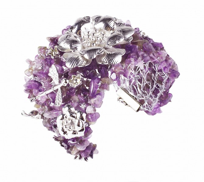 Dragonflies and foliage are the guardians of nature’s secret nurseries. There is a certain purity of silver that perfectly enhances the calm and cool of purple. The weaving of free form tumbled amethyst chips creates a mini landscape of textural interest to evoke fields of lavender, lilac, the morning glory and berries in the wilderness of the wide and wonderful. Wear the colour of royalty on your wrist to demonstrate that you can be rugged yet regal....