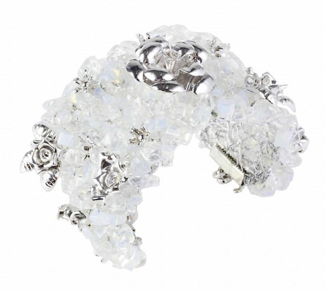 The chunky, irregular form of the crystal beads suggests an inner rebel. Silver roses add flash and glint to the composition and make reference to the romantic. Bohemian or industrial, classic or contemporary, wicked or wise, this tour de force of white is sure to find a place in your world.