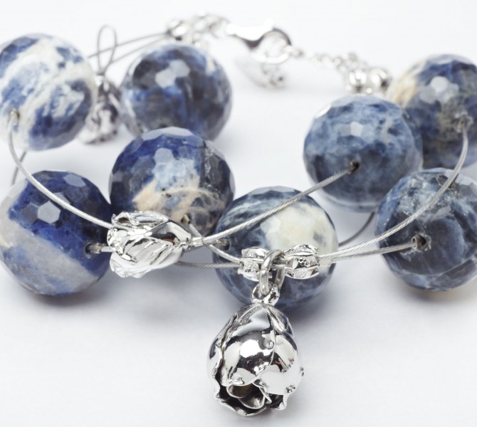 Blue orbs and sliver roses make a regal and romantic combination. Accented by little silver rosebuds, this necklace tells a story of how time transforms shy blooms into their bold, dramatic maturity. Quirky and whimsical, the blue agate rose piece never fails to make an unusual impression. ...