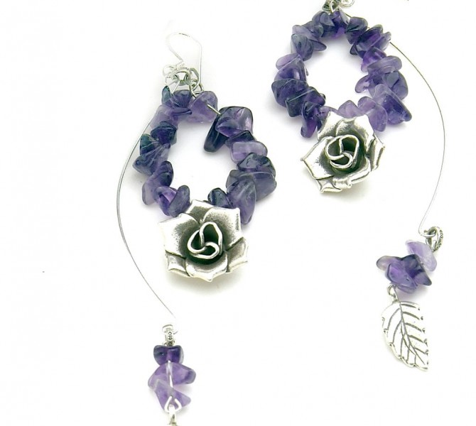 Amethyst chips of raw, irregular structure are offset by the sleek polish of silver details in floral form. Though such contrasts are contemporary, there lingers a hint of heritage; a subtle nod to the chronicles of far older symbols. The rose is a motif of hope and happiness, love and grace, devotion and beauty- even martyrdom. Wear these dramatic jewels to show your immaculate taste and artistry. ...