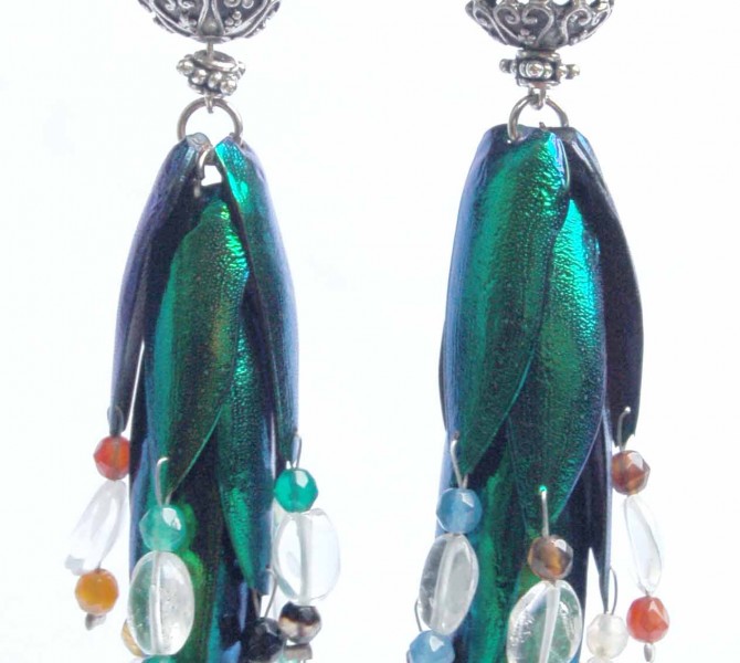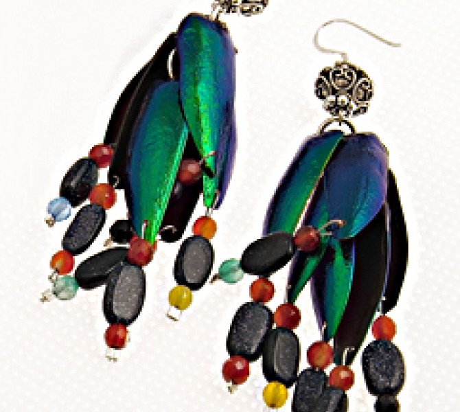 These wonderfully iridescent earrings feature genuine beetle wings that have pigments so rich and deep, we daresay their tint rivals the intensity of emeralds, the spectrum of rainbows and the depth of opals. Semi-precious beadings in red, blue and yellow enhance a feast of colour. Delicate, delightful and delicious to the eye, you could really make your ears pop with these insectile items of interest....