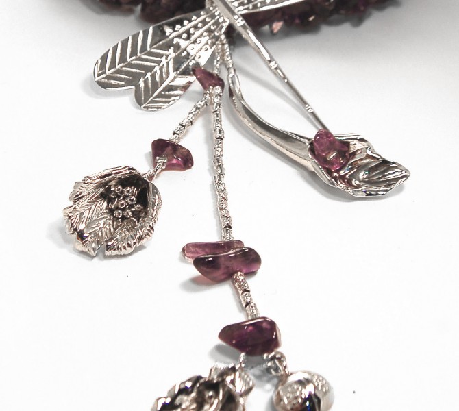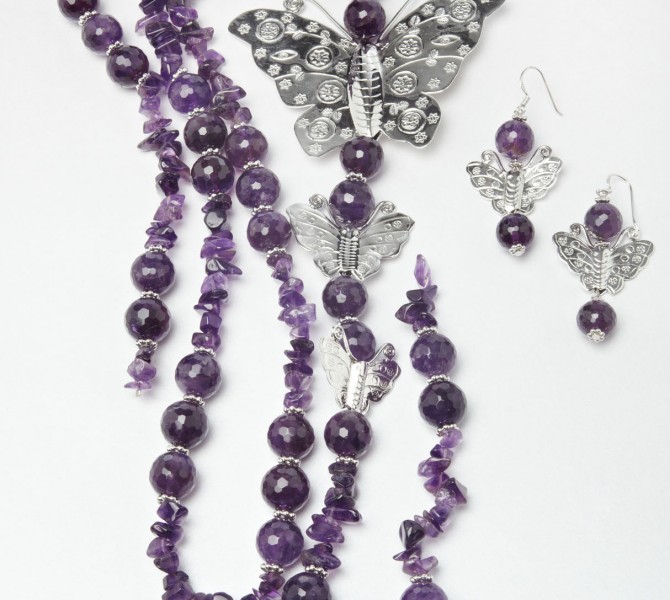 Shiny silver smiling butterflies sharply contrast with the deep lush purple of dark Amethyst. This necklace is lavish in length and bestows an air of the imperial upon its wearer....