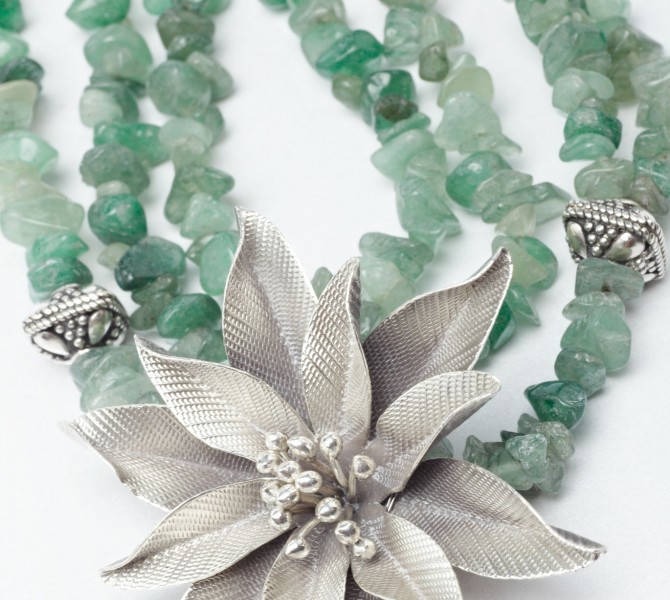 The star of this necklace is its central embellishment of a flower with twelve petals. Twelve is a special number; twelve months, twelve Olympian gods, twelve creatures of the zodiac. The flower thus adds a dimension of esoteric symbolism to the piece. Beautiful and brazen, the flower cannot help but be conspicuous. This headiness is balanced by the translucent aventurine chips. Put this on when you’re in the mood for audacity and enigma....