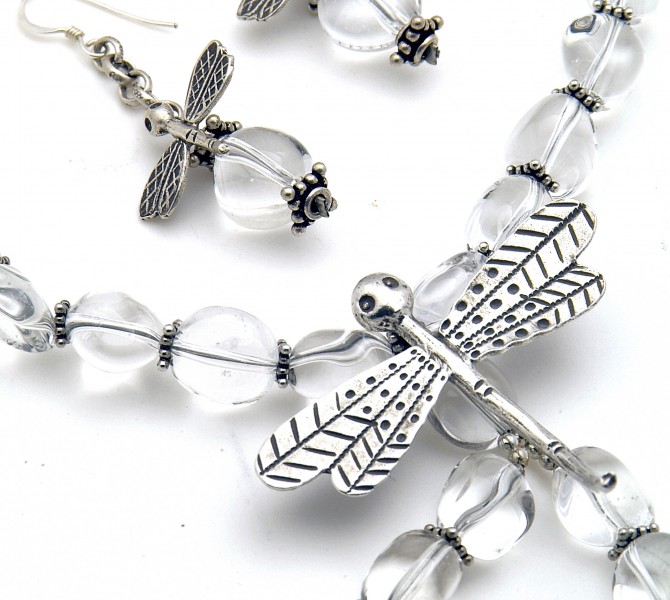 Looking at this design, you will feel like it was woven by angels! Boasting of the clarity and purity of crystal quartz, coupled with alternating punctuations of silver beadings and a silver dragonfly as the focal adornment, the simplicity and innocence of life is exuded with this angelic necklace and earring set. It is no wonder this is one of Yang Lay’s favourite creations.