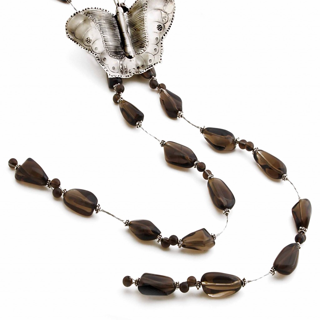 Glassy, spectral and enigmatic are some of the words one can ascribe to smoky quartz and its patrons. Prized for its unusual colour and clarity, the smoky quartz is also sought for its calming, grounding properties. This dramatic jewel has been strung with silver beads and a brilliant butterfly piece to give the necklace a boost of glistening capacity. Wear this to show that there is more to you than meets the eye.