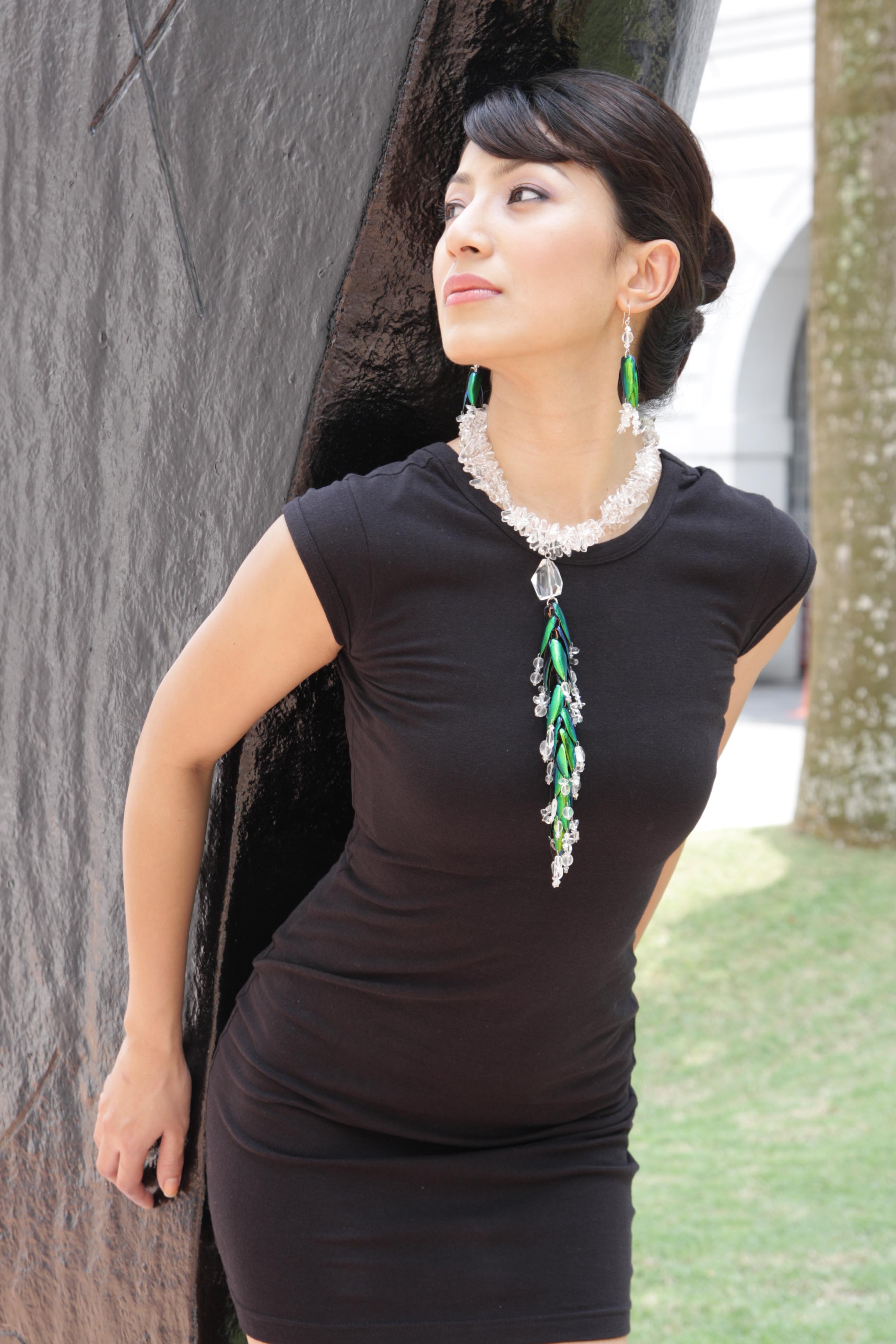 Inspired by Queen Sirikit of Thailand who encouraged her people to sell beetle wings to restore the rainforest. The rich blue-greens of the beetle wings are emphasized by an irresistible iridescence. The crystals cast a visage of ice and sheen over the neck.