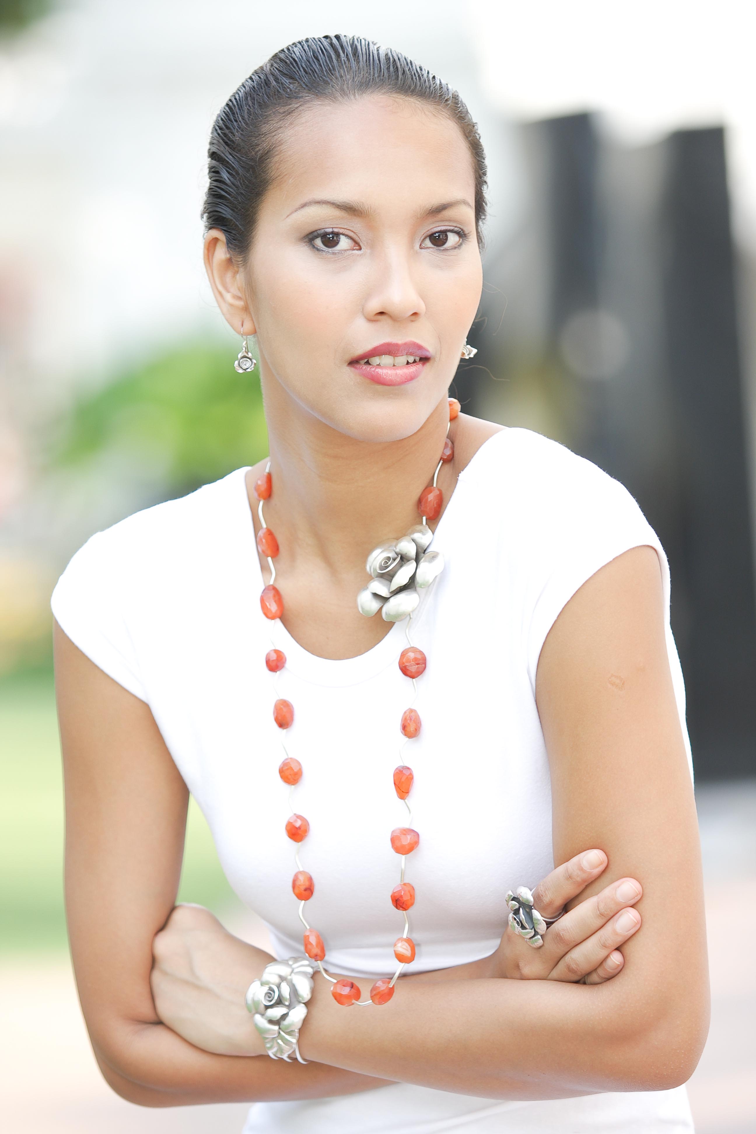 Many deem the lively orange carnelian as an advocate of creativity, and the Egyptians believed in its power to dispel fury and tetchiness. The single rose wrought in 925 silver is a symbol of simplicity and faith in love.