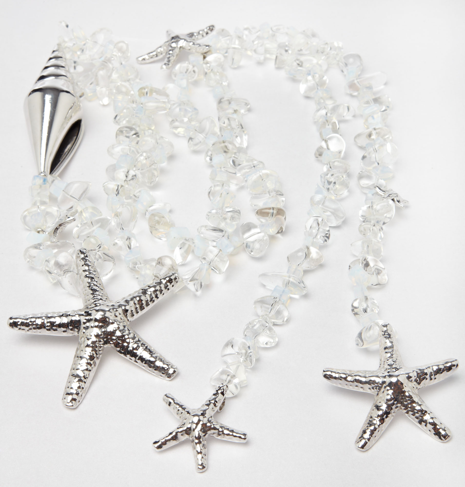 Silver starfish, translucent opals and clear crystals all help us recall the solitary splendor of a moonlit seaside. Organic yet mystical, wear this (literally) star-studded delight to transform into a siren of both daytime and nocturnal shift.