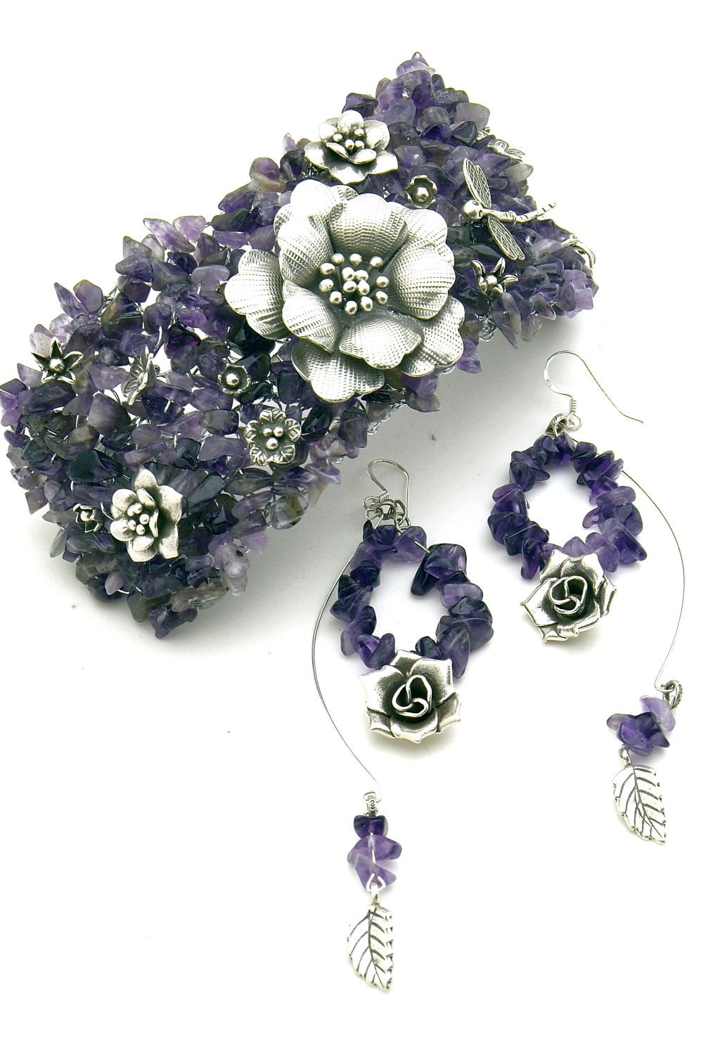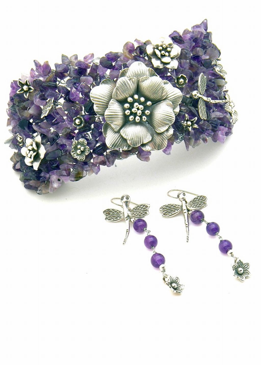 Dragonflies and foliage are the guardians of nature’s secret nurseries. There is a certain purity of silver that perfectly enhances the calm and cool of purple. The weaving of free form tumbled amethyst chips creates a mini landscape of textural interest to evoke fields of lavender, lilac, the morning glory and berries in the wilderness of the wide and wonderful. Wear the colour of royalty on your wrist to demonstrate that you can be rugged yet regal.