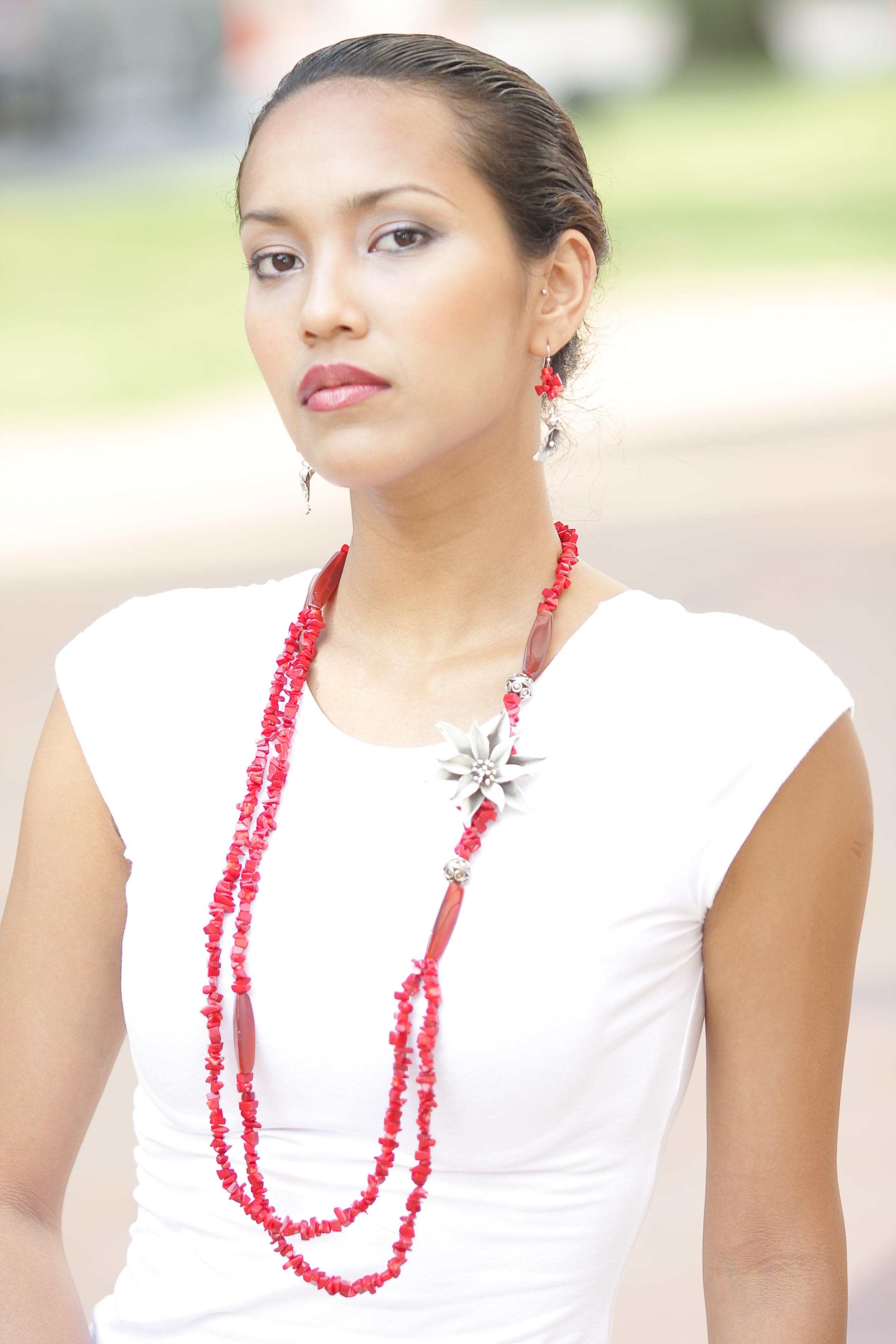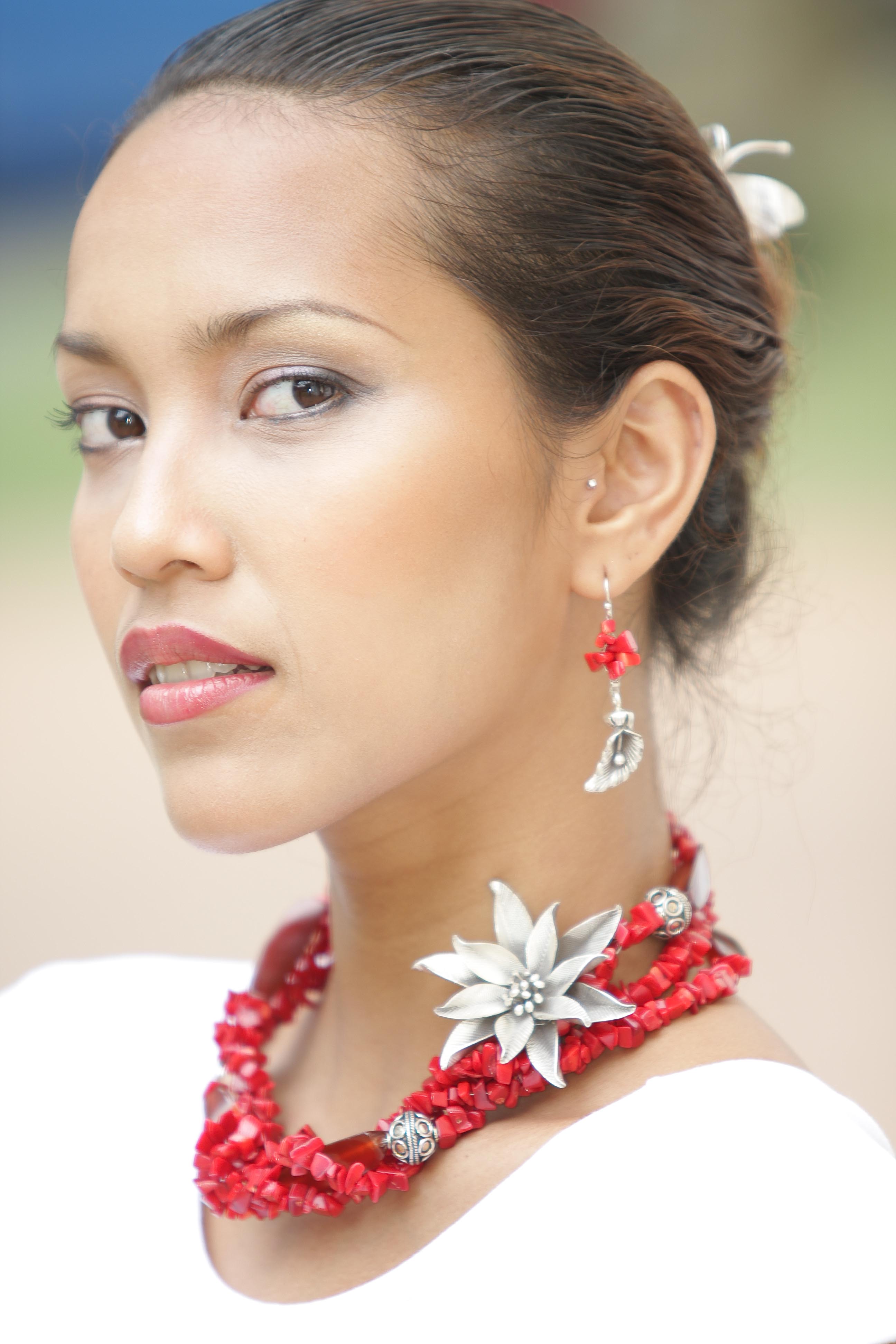 Rich red coral chips accompany an ornate poinsettia to ensure a feast for the visual palate. Red is the colour of life, and silver, the choice of sophisticates. Poinsettia is also known as the Winter Rose, for it represents mirth and merry at year-end gatherings. You may be wearing a winter bloomer, but don’t let that stop you from parading this at parties all year round, taking people’s breath away.
