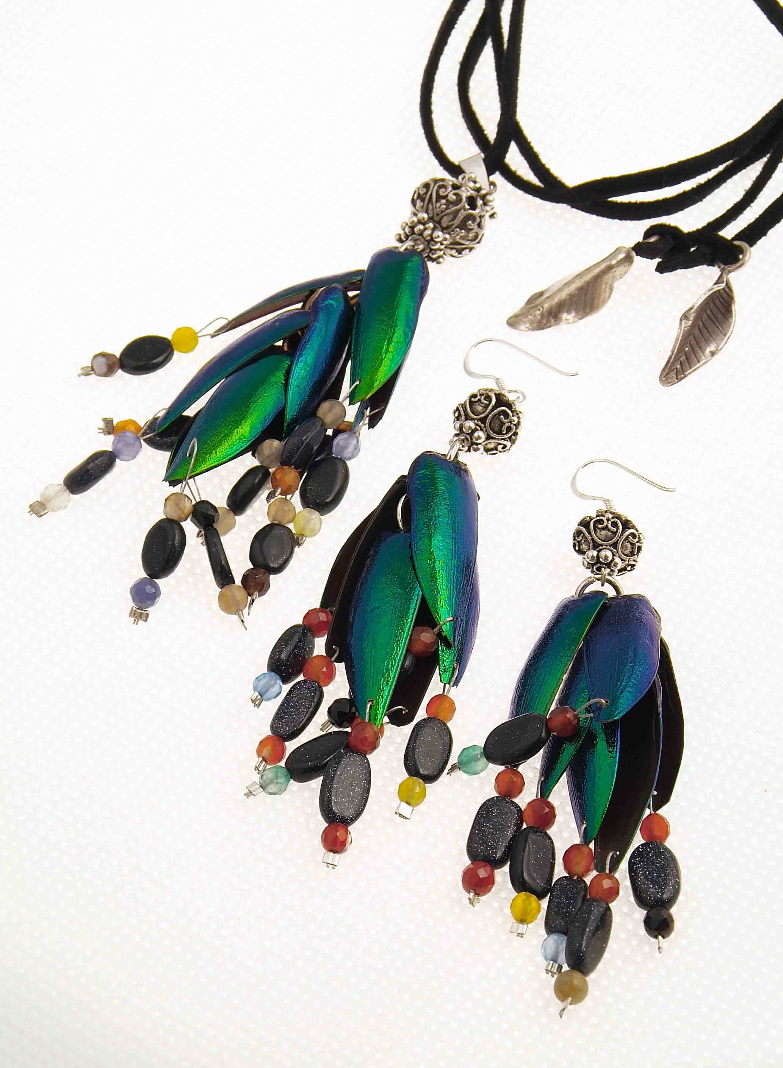 This simple pendant combines the twinkle of Silver sandstonewith the gleaming brilliant emerald green of the Asian Jewel Beetle Wing to great effect. It is an easy attention grabber for all who want to bring interest to the neckline or collarbone without being pompous.