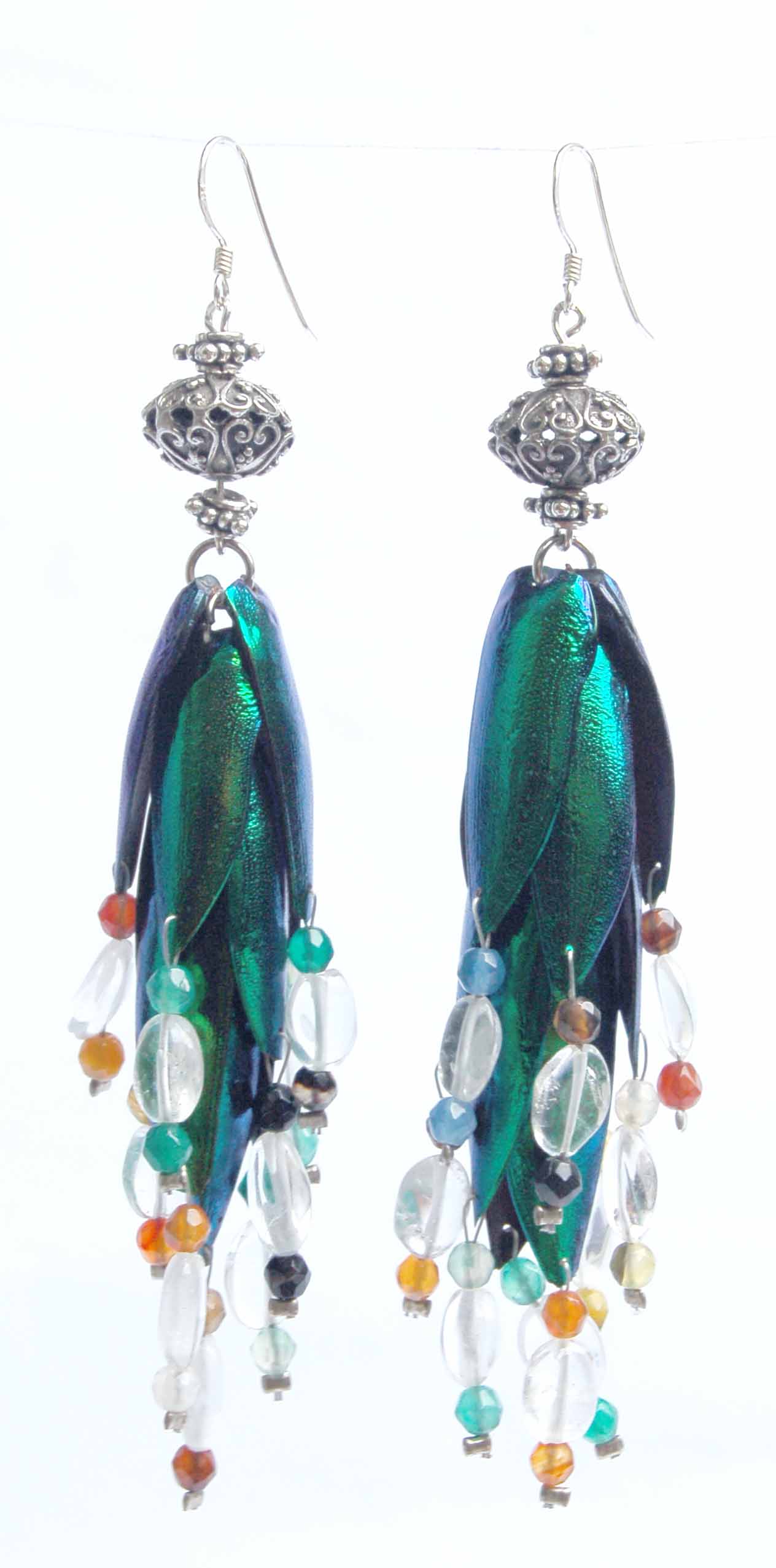 Rare as they are beautiful, these stunning earrings feature delicate beetle wings, little egg-shaped crystal quartz and an assortment of agate rounds. The clear oval crystals resemble gathered dew on hatching cocoons, while the agate beads add a splash of festive colour that harkens the arrival of the newly matured. Ideal gifts for those who are about to undergo a life-changing experience these earrings hold the secret of how the pilgrimage of obscurity can lead to the development of outstanding eminence. Also appropriate for those who dare to take chances, Outlandish opulence is for the bold soul among mice.