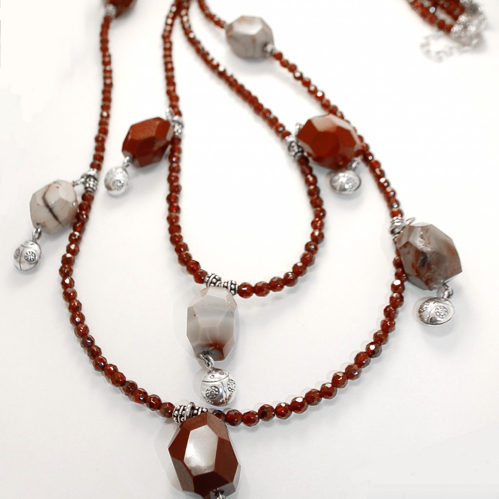 Ladybirds are renowned as traditional symbols of luck, as is the colour red. These lucky elements have been combined; the insect in silver, the red in the vibrant shades garnets, to create a necklace that is a double-stranded powerhouse of optimistic motivation. Don this profusion of energizing tokens to preserve your get-up-and-go.
