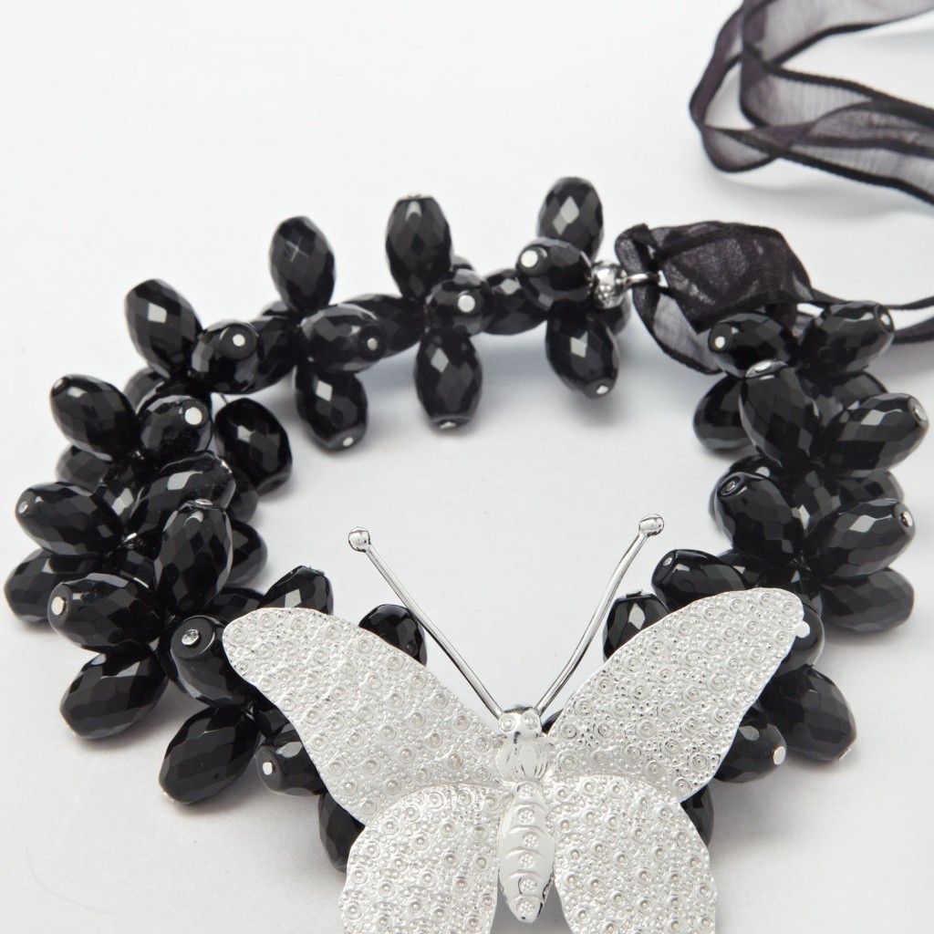 This black onyx necklace being highly polished and having a fine finish, sports an unusual shine to it. This creation is made by weaving black onyx stones together after they have undergone careful detailing and polishing. Together with the onyx stones is a piece of smiling butterfly made purely of 925 silver. The bright silver piece stands out from the black glossy onyx, giving this design a more delicate touch. This is one piece of art that will definitely catch many eyes.