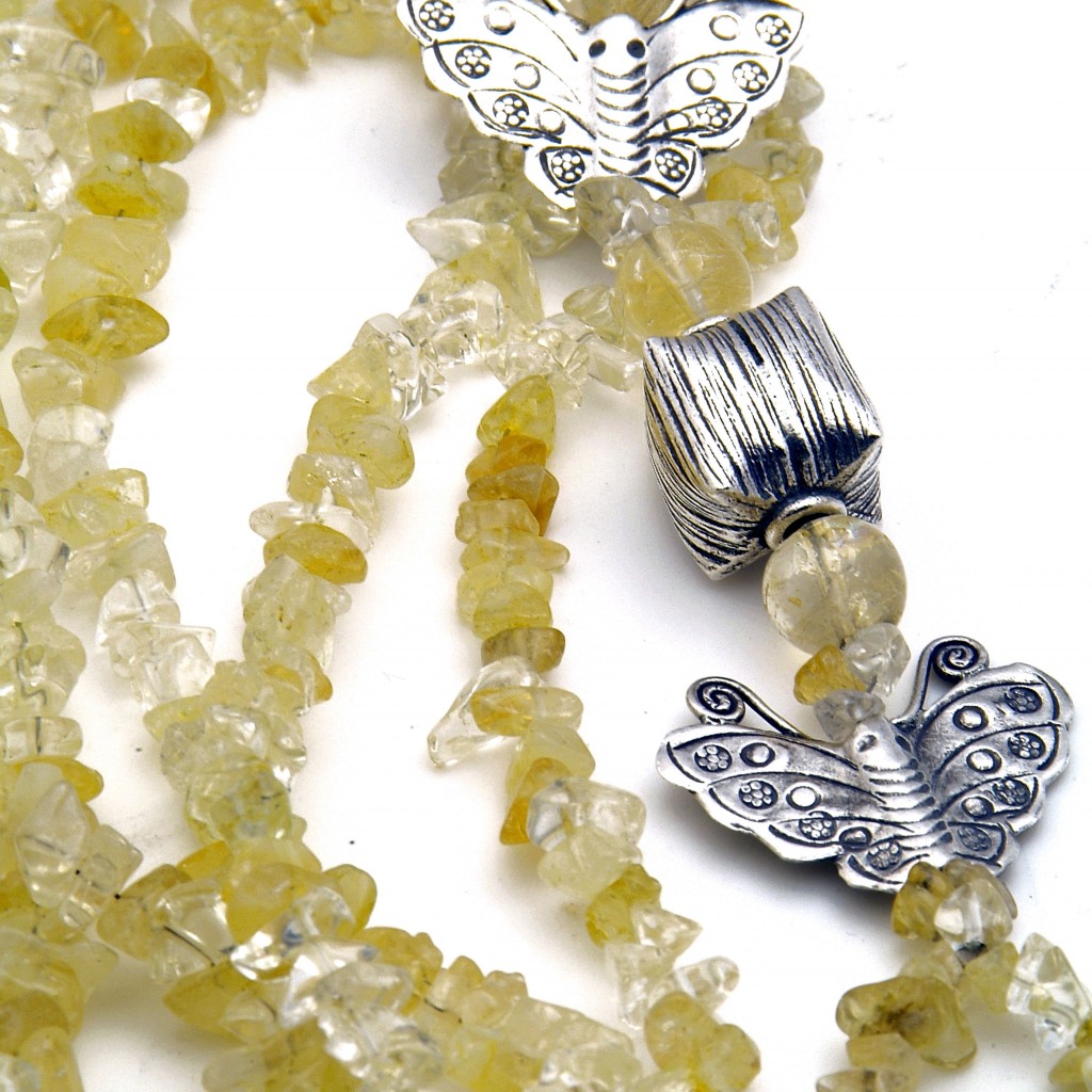 Feeling blue? Put this on. Long and lovely, this necklace radiates positivism. Silver smiling butterflies and clear, lemon yellows of Citrine trigger good vibes. The Citrine chips remind us of frozen lemonade popsicles in summer. Two butterflies flutter beside a silver cube, gently reminding us to “look outside the box”. Look on the bright side of life and dance through life with these swishy, sunshiny sparkles!